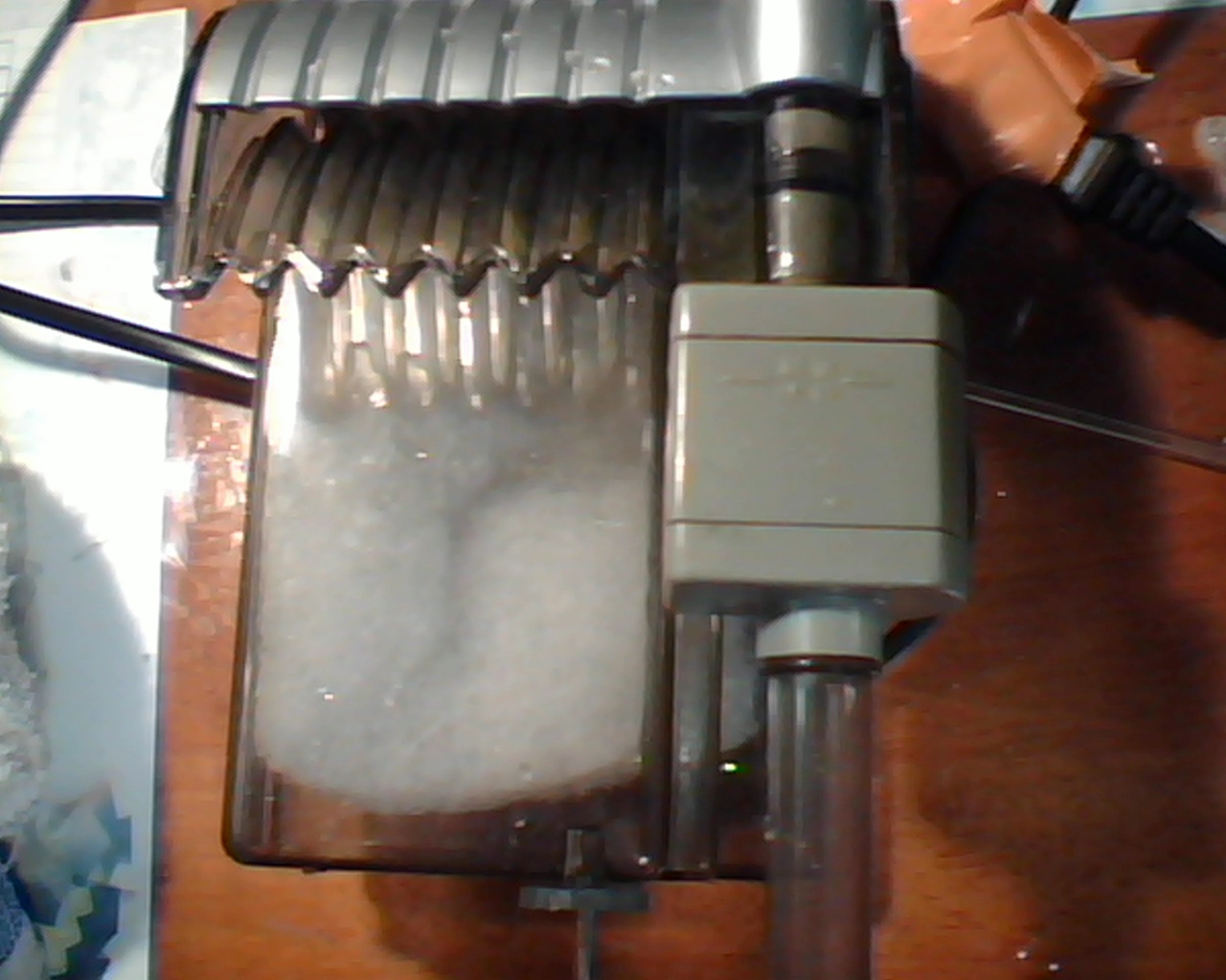 フィルターには物理ろ過目当てのスポンジしか入れていません。様子を見て、生物ろ過フィルターを設置するかもしれません。