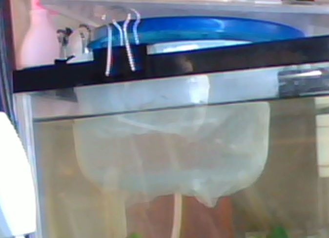 早速、自作飼育スペースを水槽に設置します。設置はクリップで止めただけです。この30センチ水槽はガラスの水槽の上にプラスチックの枠みたいなものがありますので、そこにクリップで止めます。ガラスの部分で止めると傷付くのが怖いです。