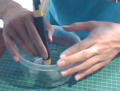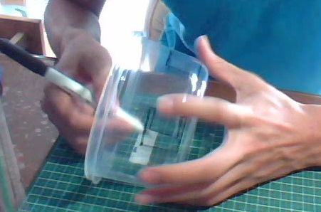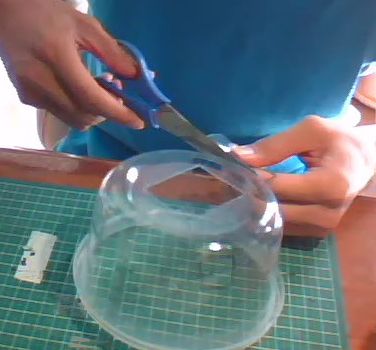 まず容器に穴を開けます。カッターとハサミを使ってきりました。