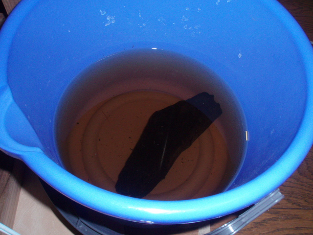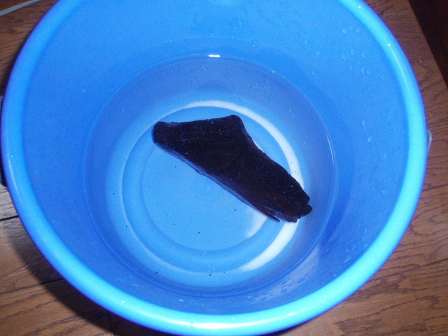 適当なところで止めたらバケツか何かに水を入れて、重曹を入れます。重曹はアク抜きに効果があるそうです。重曹も適当に入れて溶かします。次に流木を入れます。数日経つと水が濁るのでその度に水を交換します。この行程は煮沸した場合抜いても良いかもしれません。