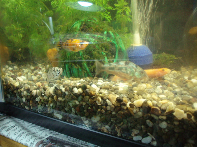 オレンジのモーリーがちょっと気が強いみたいで困っていましたが、追いかけたりつつく行為も無くなってはいませんが、除々に少なくなってきています。エサを入れたときや白黒のモーリーには相変わらず追っかけまわしています。