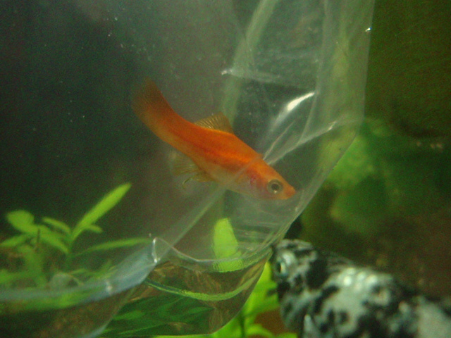 新しい仲間にレモン×白のライヤーテールモーリーと真っ赤なソードテールがうちの水槽に入りました。